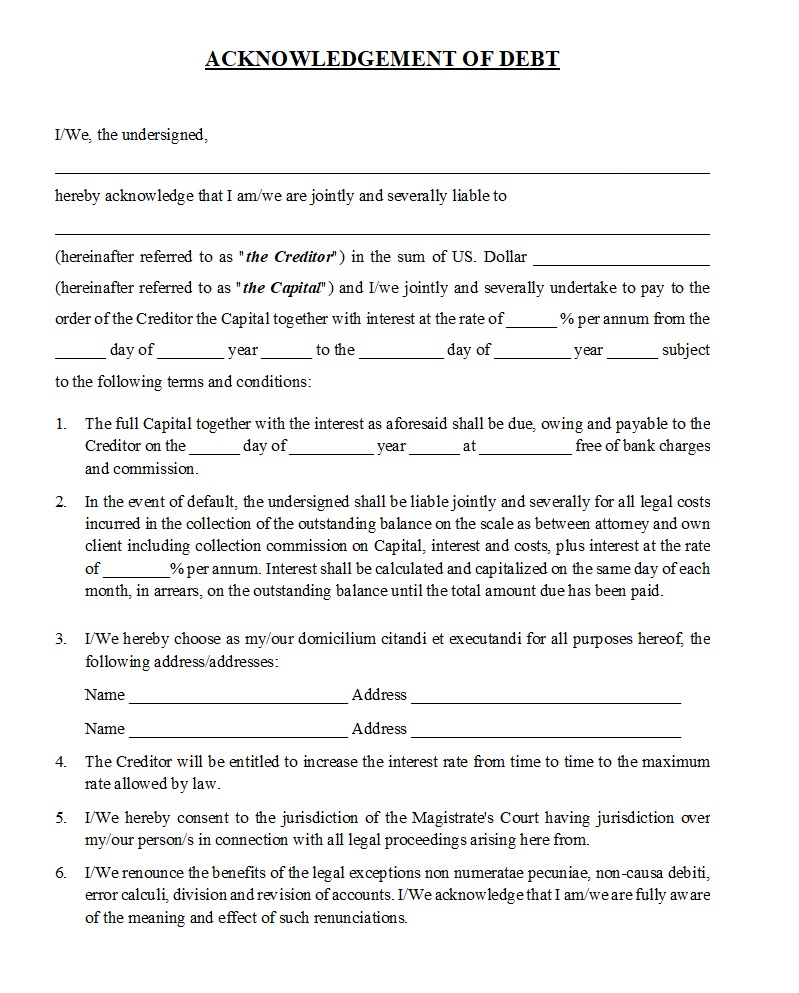 The document is a crucial financial document that formalizes and confirms the existence, terms, and conditions of a debt obligation between a debtor and a creditor. It serves as a vital tool for establishing legal clarity, facilitating transparent communication, and ensuring mutual understanding and compliance with the agreed-upon repayment terms. Both parties should carefully review and understand the acknowledgment of debt, seek legal advice if necessary, and adhere to the agreed terms to maintain a healthy and cooperative financial relationship while safeguarding their respective interests and rights.