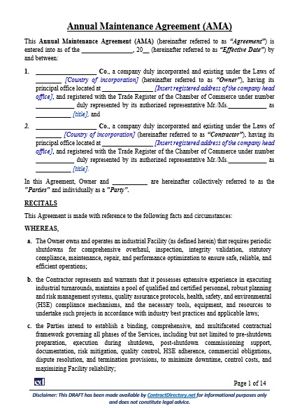 A well-constructed Annual Maintenance Agreement ensures that recurring maintenance does not become fragmented, inconsistent, or dependent on informal practices. It provides a governance framework that aligns technical, operational, and legal expectations within a single document, enabling both parties to work with precision and accountability.