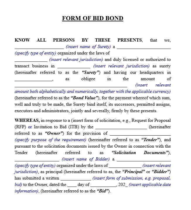 A Bid Bond protects the project owner during the tender stage. Contractors submit this bond with their bid to show commitment. It guarantees that the contractor will sign the contract if selected. The bond also ensures the contractor provides the required performance security after award.
