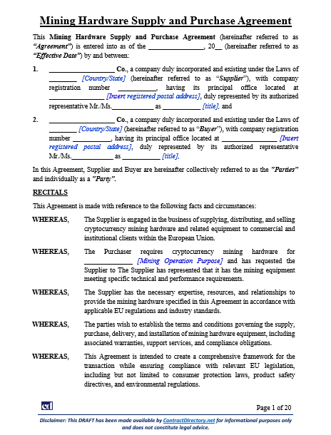 A Mining Hardware Supply and Purchase Agreement provides structure and legal certainty for every mining equipment transaction. It combines operational, technical, and financial elements to protect both buyer and supplier. With compliance and transparency built in, this contract supports stable, lawful growth in the cryptocurrency mining industry.