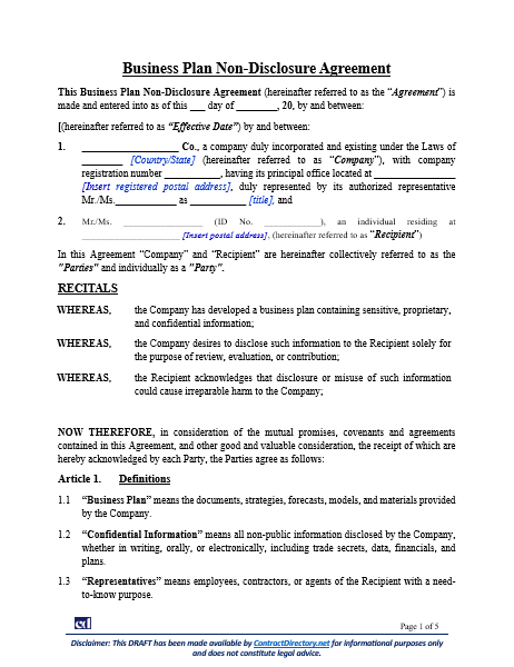 A Business Plan Non-Disclosure Agreement functions as a legal tool when companies share sensitive business plans with potential partners, investors, or advisors. It protects proprietary information such as strategies, trade secrets, forecasts, and financial models. When signing, the recipient accepts that disclosure could damage the company’s competitive position and therefore commits to strict confidentiality obligations.