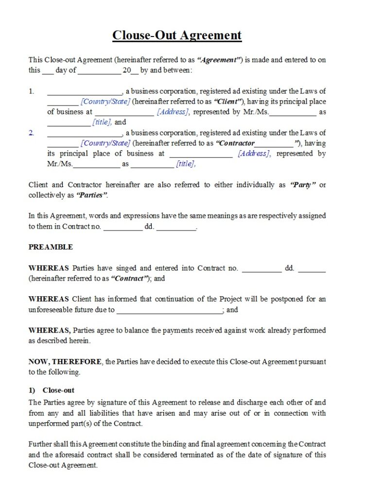 Sometimes, unforeseen problems force a project to stop before completion (This is the subject of this Agreement). In such cases, parties may still sign a Close-Out Agreement. The document records unfinished deliverables, settles financial matters, and outlines responsibilities for suspension. It ensures clarity even when projects cannot proceed as planned.