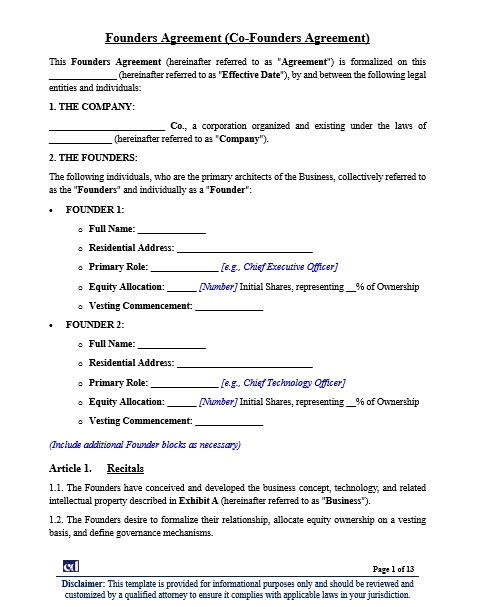 A Co-Founders Agreement formalizes the relationship between individuals who create and build a company together. It allocates equity on a vesting basis, defines roles, and establishes decision-making rules.