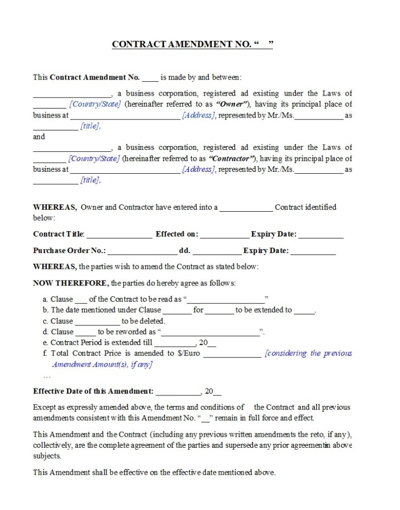 The primary purpose of a Contract Amendment is to introduce controlled and documented changes to an existing agreement. Circumstances often evolve during a project or business relationship—new regulations may arise, technical requirements may shift, or external factors may make certain provisions impractical. Instead of terminating and redrafting the entire contract, the parties can formalize their adjustments through a written amendment.