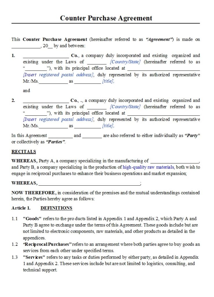 A professional Counter Purchase Agreement includes two independent contracts, each detailing its own scope, price, payment method, and delivery terms. The agreement usually contains: