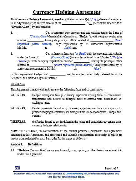 In global commerce, exchange rate volatility can have significant financial consequences. A Currency Hedging Agreement gives companies the framework to manage this risk effectively. It protects both the Hedger and the Dealer by clearly defining obligations, remedies, and procedures, allowing international business transactions to proceed with greater confidence.