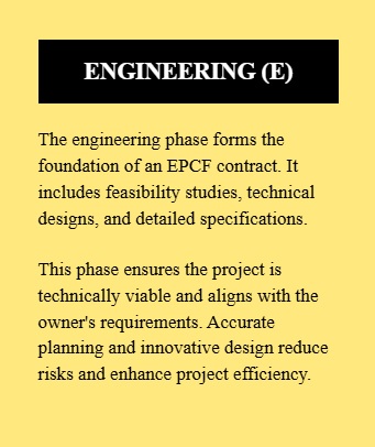 The engineering phase establishes the technical backbone of an EPCF Contract. It covers feasibility analysis, conceptual and detailed design, technical specifications, and performance criteria. This stage ensures that the project meets regulatory, operational, and lender requirements. Accurate engineering reduces design changes, supports cost certainty, and forms the basis for financing approvals. In EPCF projects, lenders rely heavily on engineering outputs to assess technical risk and long-term viability.