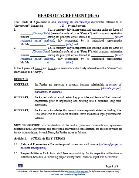 A Heads of Agreement (HoA) is a preliminary contract that sets out the main terms of a future deal. It outlines intentions, responsibilities, and financial principles before parties sign the full contract. The HoA provides clarity and confidence during the negotiation stages. It bridges informal discussions and binding contracts by documenting agreed principles.
