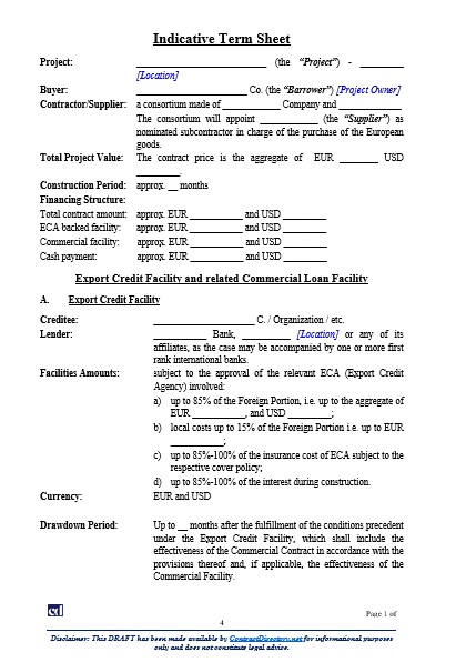 An Indicative Financing Term Sheet for Export Credit and Commercial Loan Facilities outlines the preliminary financial structure of a project. It serves as a roadmap for borrowers, lenders, and export credit agencies before final documentation.