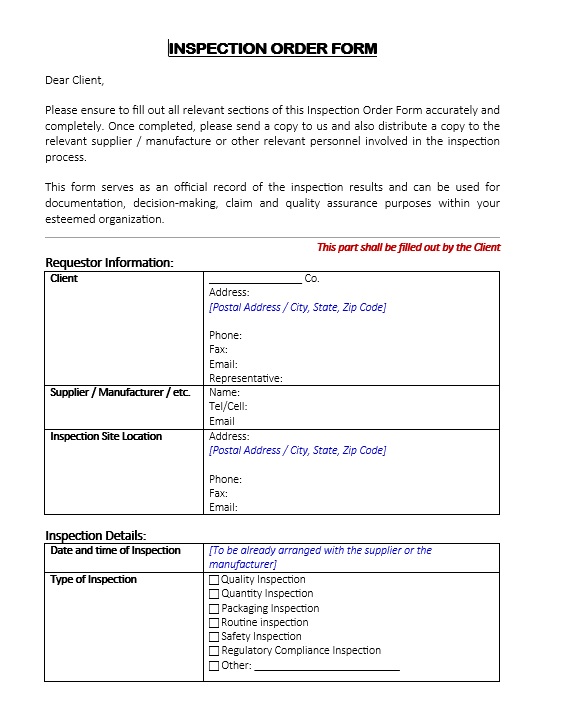 Inspection Order Forms reduce misunderstandings and help teams manage complex tasks. They define expectations early and guide inspectors during the entire process. Because the information stays organized and traceable, businesses avoid delays and maintain consistent quality. These forms also strengthen operational safety and support compliance with industry or governmental standards.
