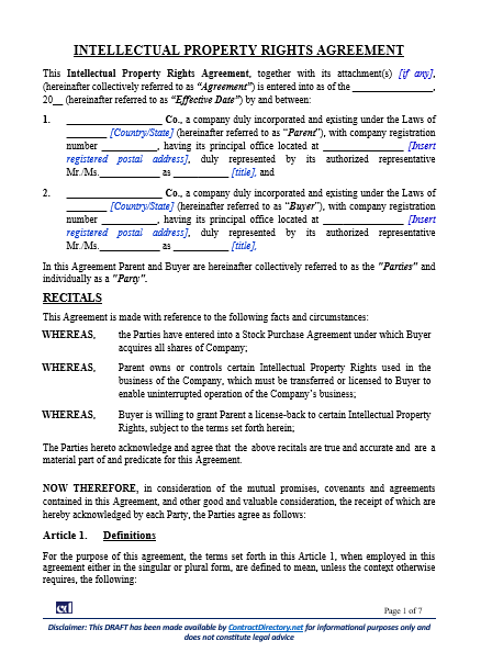 This IP Rights Agreement follows a structured approach. It begins with Recitals outlining the relationship between the parties—typically a Parent and Buyer. Subsequent sections define key terms, including Assigned Intellectual Property, Licensed Intellectual Property, and Affiliate. Articles 2 to 5 address how ownership is transferred or licensed back.