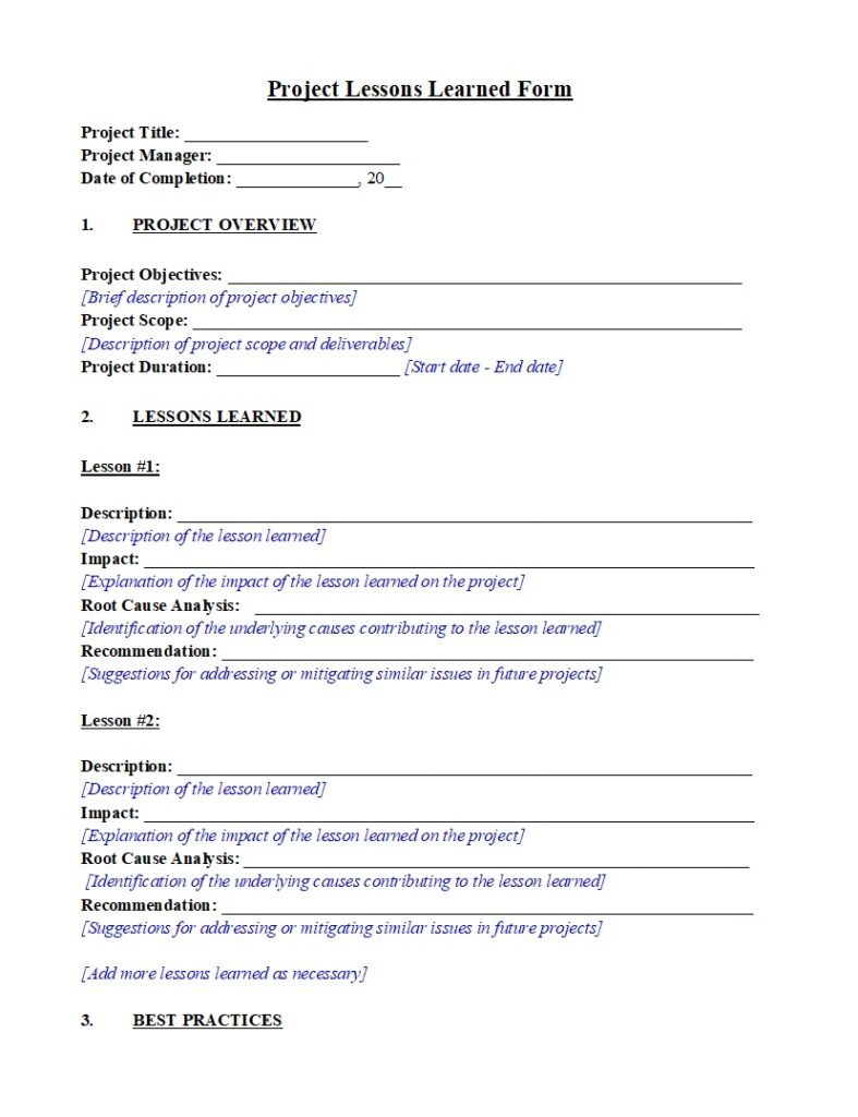 Using the Lessons Learned Form promotes transparency and accountability within and strategies in future projects. By systematically collecting feedback, teams can recognize recurring patterns, mitigate risks, and replicate successful practices. This proactive learning process minimizes repetition of past mistakes and supports informed decision-making at every project stage. Moreover, it aligns with organizational objectives for quality assurance, governance, and operational excellence.