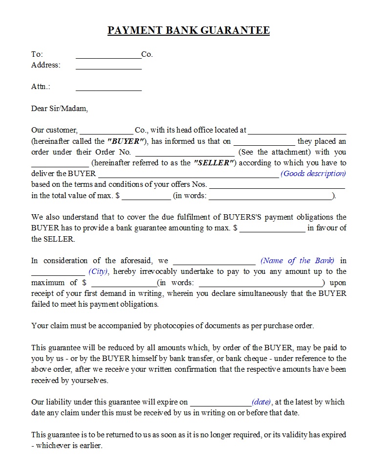 The guarantee document names the buyer as applicant, the seller as beneficiary, and the bank as guarantor. It specifies the guarantee amount, validity period, and claim procedure. It often requires the seller to present a simple written demand for payment. Conditions may also include presenting unpaid invoices or proof of contract breach. The guarantee usually works as an irrevocable and unconditional obligation, giving the beneficiary strong security.