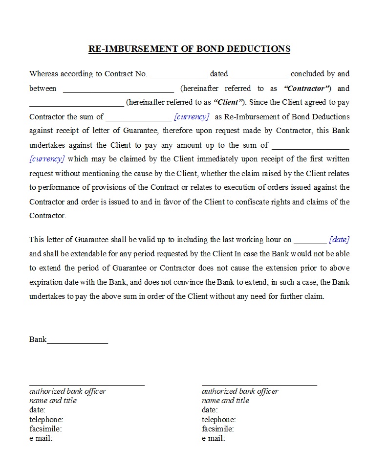In many contracts, especially those in construction or supply deals, a bond is provided as security to ensure the fulfillment of contractual obligations. If the obligated party (such as a contractor or supplier) fails to meet its obligations, the beneficiary of the bond (often the project owner or buyer) may make deductions from the bond amount to cover the losses or damages incurred.