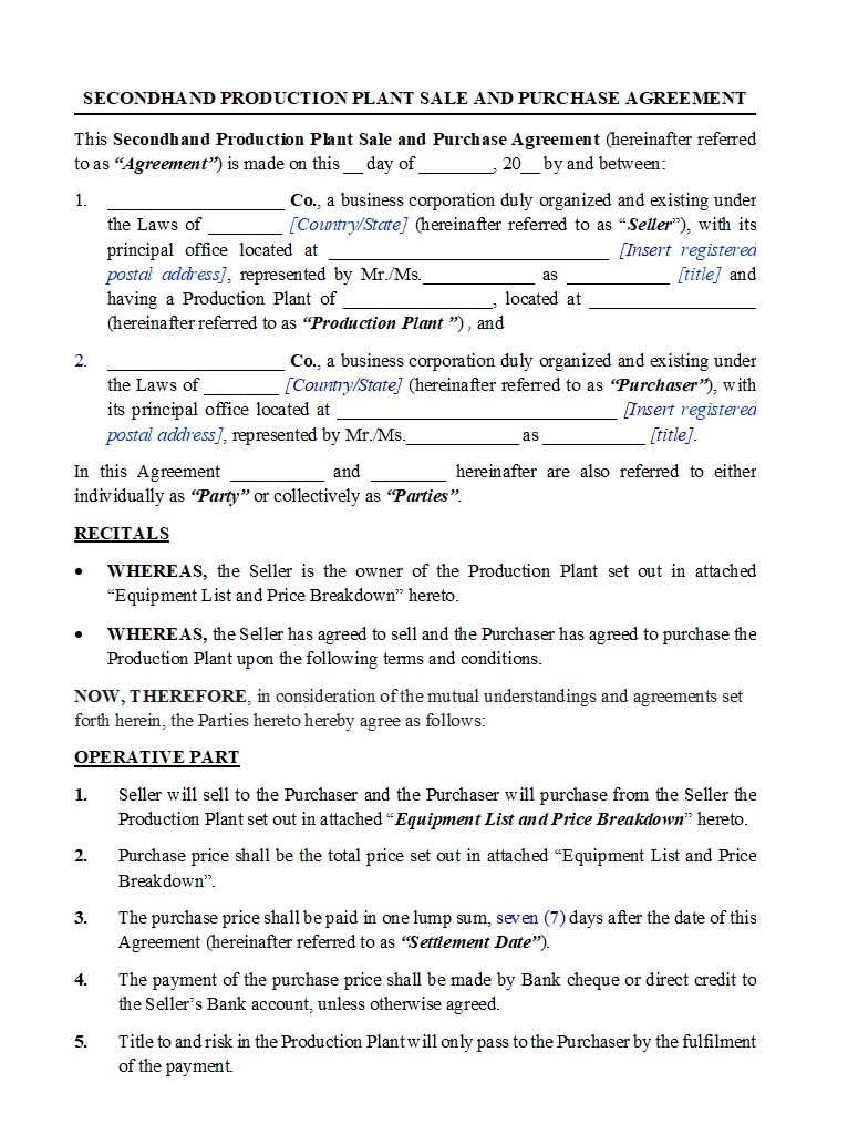 A Secondhand Plant Sale and Purchase Agreement governs the transfer of ownership of large-scale used machinery, equipment, and industrial assets between parties. This type of contract is essential in manufacturing, construction, agriculture, and related industries where secondhand plants and equipment play a key role in reducing costs and maintaining operational efficiency.