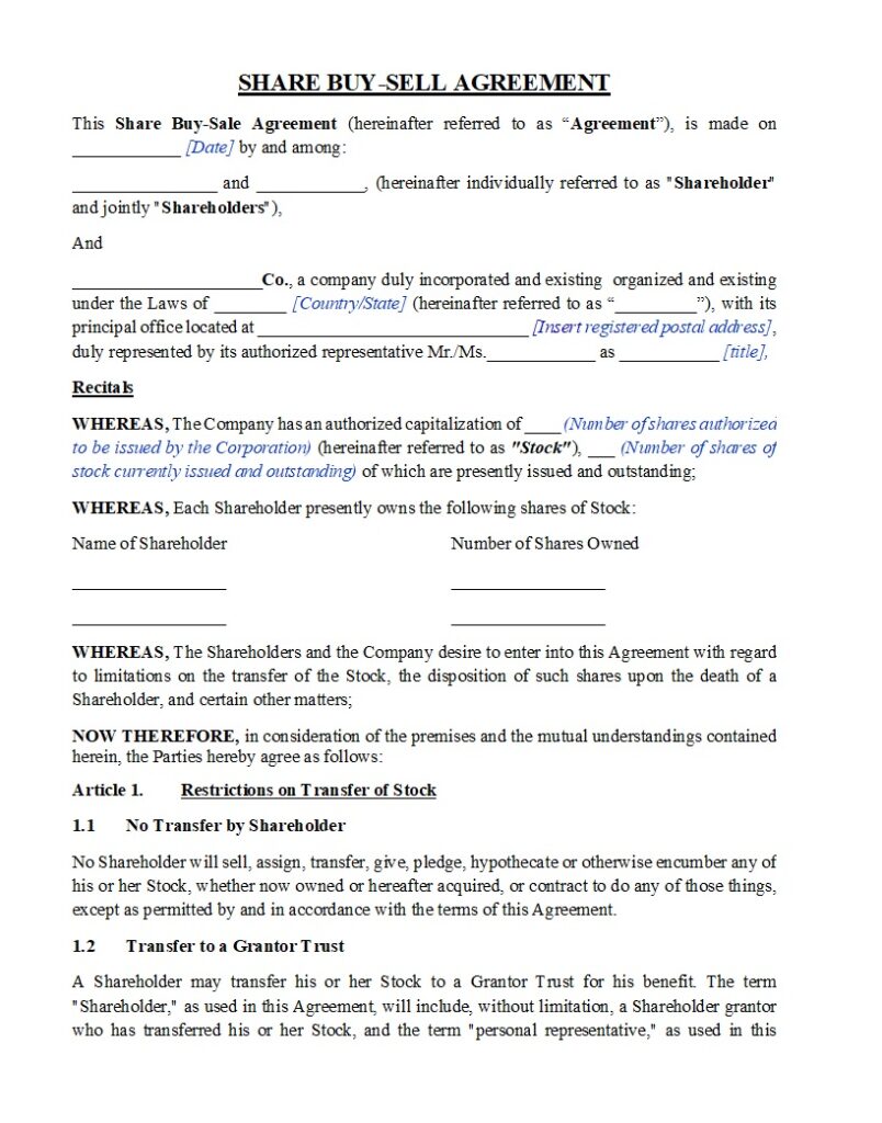 Determining the share value is essential. The agreement specifies a valuation method. This could involve a fixed price, a formula, or an independent appraisal. Clear valuation methods prevent disputes over the share price during ownership transfers.