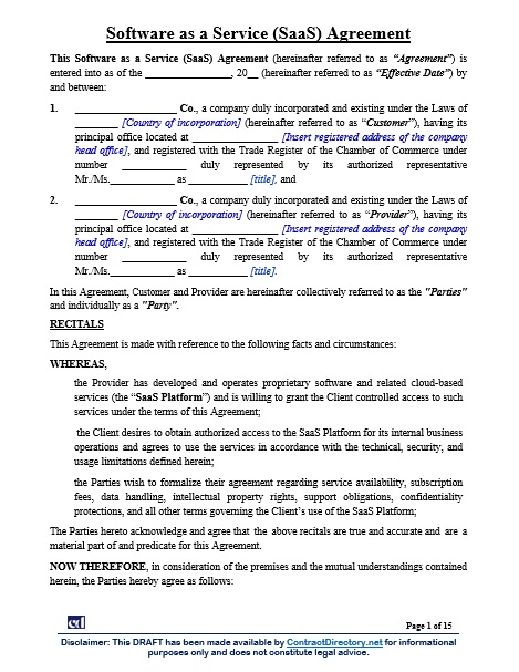 The Software as a Service (SaaS) Agreement also clarifies intellectual-property rights by confirming that the provider retains ownership of the software, underlying systems, and platform components. Meanwhile, the customer receives controlled access for internal use only. Furthermore, the agreement explains subscription fees, billing cycles, overdue payments, and upgrade or downgrade procedures. If either party ends the contract, termination clauses guide data export, account closure, and the final responsibilities of both sides. Therefore, the entire lifecycle of the SaaS subscription follows structured and predictable terms.
