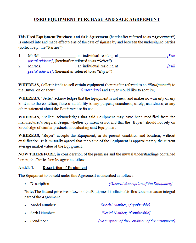 The agreement outlines essential details of the transaction. These include the description of the equipment, the agreed purchase price, and the payment schedule. Furthermore, it specifies delivery arrangements and addresses whether warranties or guarantees are offered by the seller. As a result, both parties operate with clarity and confidence.